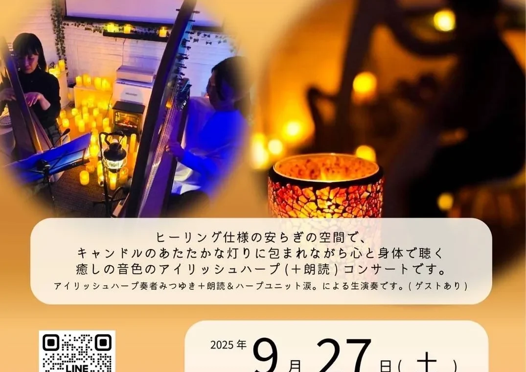 ヒーリング仕様の安らぎの空間で、キャンドルのあたたかな灯りに包まれながら心と身体で聴く癒しの音色のアイルッシュハープ(+朗読)コンサートです。