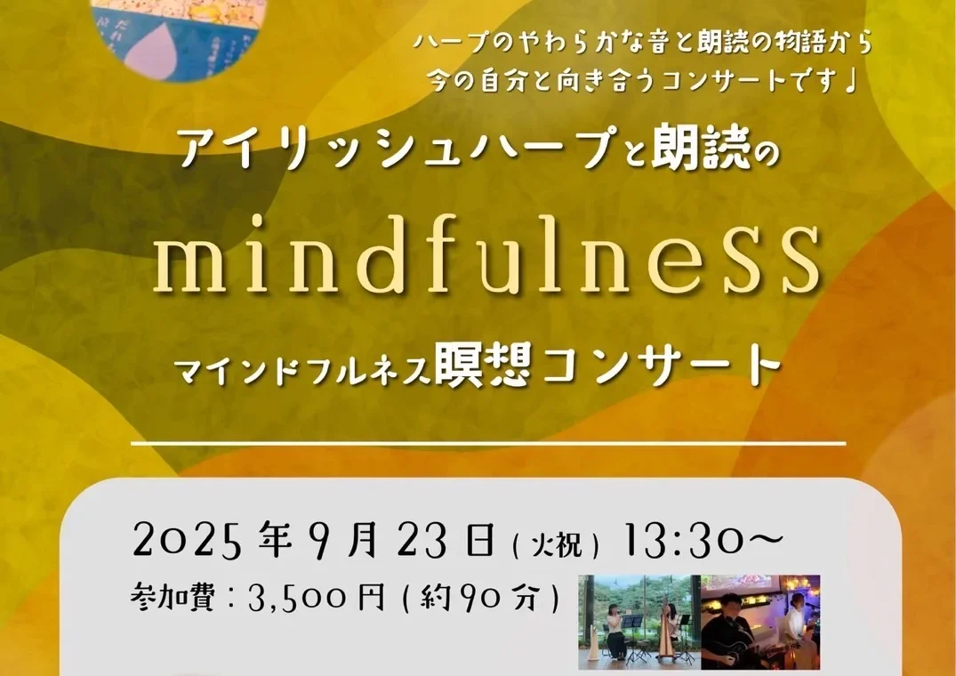 癒しの楽器と言われるアイリッシュハープの優しい音色と朗読の物語から、今の自分自身を見つめるマインドフルネス瞑想コンサートです。
