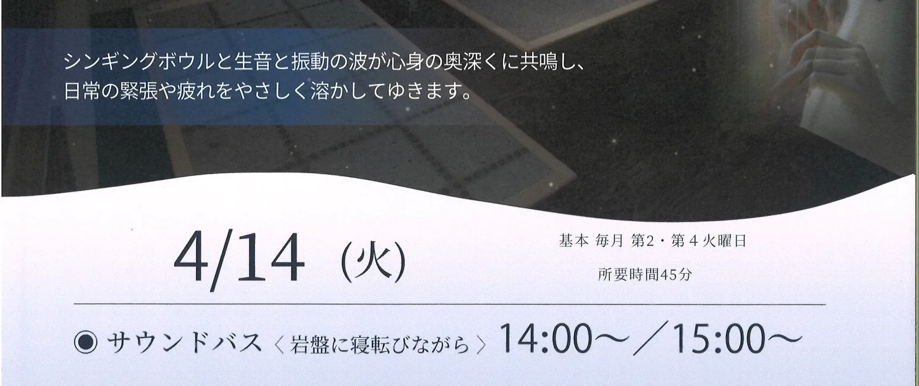 上質な岩盤に寝そべってシンキングボウルの生演奏をまどろみの中全身で聴く、究極のリフレッシュタイムを。鉱石のエネルギーを感じながらシンキングボウルの響きに包まれる体験をどうぞお楽しみ下さい♪